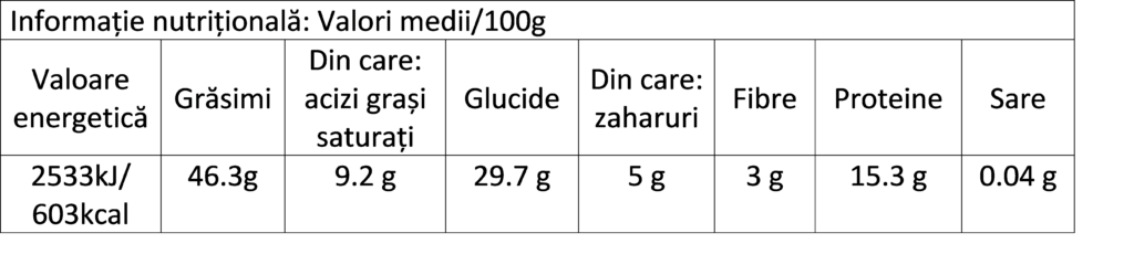 Poate conține urme de: migdale, alune, arahide, nuci, muștar, semințe de susan, gluten.